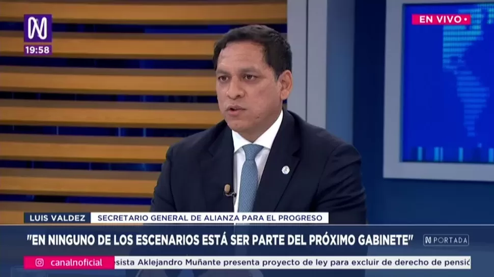 N PortadaLuis Valdez: APP siempre apoyará la gobernabilidadN Portada / Canal NN Portada, de lunes a viernes a partir de las 07:00 p.m. por Canal N TagsN PortadaRelacionadasEnrique Ghersi: La mayoría en el TC se ha pronunciado a favor de Keiko FujimoriMarisol Pérez Tello: Yo no integraría el gabinete de José JeríHernán Chaparro: El país vive un clima enrarecido y de cansancio socialDomingo García Belaunde: Los ministros se quedan para entregar el cargoFlavio Cruz: Comprendo la reacción de la población en Puno contra ButtersGiovanna Vélez: Mi tesis luego se convirtió en un libro