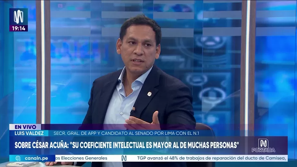 N PortadaLuis Valdez: El coeficiente intelectual de César Acuña es mayor al de muchas personasN Portada / Canal NN Portada, de lunes a viernes a partir de las 07:00 p.m. por Canal N TagsN PortadaRelacionadasJaime de Althaus: La causa de la caída de Rafael López es el apoyo a la censura de JeríCarlos Mesía: Jamás he pisado una comisaríaTGP mantiene plazo de 14 días para establecer servicio de gasAlex Curi León: Tenemos 60 familias y sectores aledaños afectadosJosé Manuel Villalobos: La valla solo es para acceder al CongresoJacques Rodrich: La ineficiencia de la empresa privada es condenable