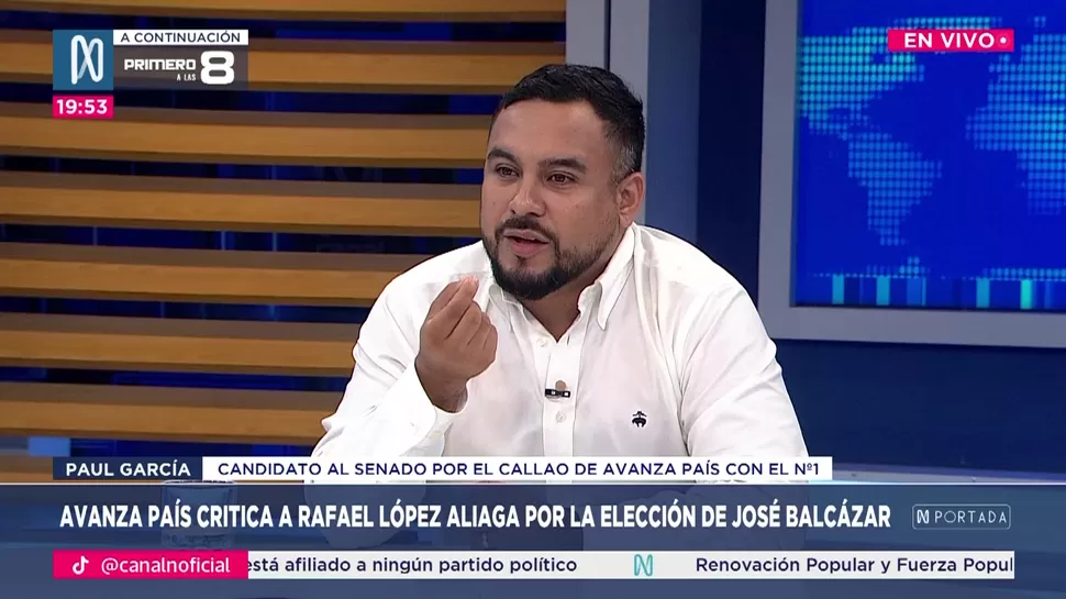 N PortadaPaul García: Avanza País votó por Maricarmen Alva N Portada / Canal NN Portada, de lunes a viernes a partir de las 07:00 p.m. por Canal N TagsN PortadaRelacionadasCarlos Caro: El indulto común no podía prosperarCarlo Magno: Esto es prácticamente una dictadura parlamentariaCésar Vásquez: APP siempre ha apostado por la gobernabilidadMartha Chávez sobre Renovación Popular: Tienen una campaña agresiva con cálculo políticoJuan José Abad: Estoy seguro que Maricarmen va a ganar la selección Jeffrey Radzinsky: Creo que los candidatos de izquierda tendrán poco peso mañana