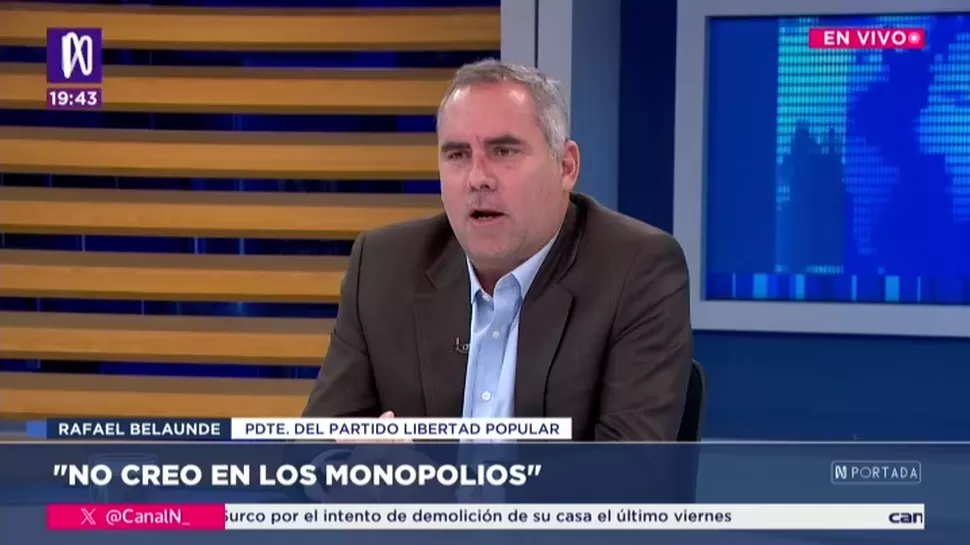 N PortadaRafael Belaunde: Tiene que ser más fácil para el Perú hacer inversionesN Portada / Canal N N Portada, de lunes a viernes a partir de las 07:00 p.m. por Canal N TagsN PortadaRelacionadasEnzo Elguera: Respaldo la reducción del plazo para difundir encuestas a 3 días antes de eleccionesCarlos Basombrío: La Policía se está volviendo muy abusivaJuan Abad: Tres congresistas renunciaron y dos fueron expulsados de Acción PopularJuan Rosales: El Congreso es visto como el sector o institución con más poderMiguel Palomino: Los conductores estamos asustados, no podemos trabajarSebastián Ortiz: El nuevo ministro de Justicia registra 14 investigaciones penales, 4 siguen vigentes