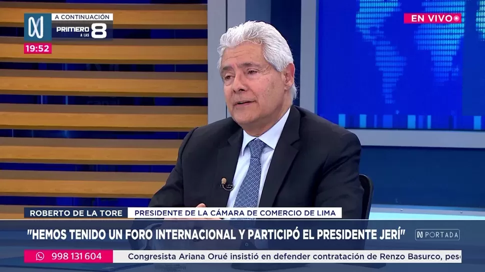 N PortadaRoberto de la Tore: Debemos buscar una información verazRoberto de la ToreN Portada, de lunes a viernes a partir de las 07:00 p.m. por Canal N TagsNPortadaRelacionadasAron Espinoza: López Aliaga debió ponerse de acuerdo con el concesionarioFrancisco Tudela: La guerra contra el terrorismo no tiene fronterasDiego Macera y Felipe James analizan el mensa a la NaciónLourdes Flores Nano descarta postular en las elecciones generales de 2026Walter Gutiérrez: Petroperú es una empresa politizada y mal gestionadaLuis Miguel Castilla: Petroperú ocultó nuevo respaldo financiero del Estado