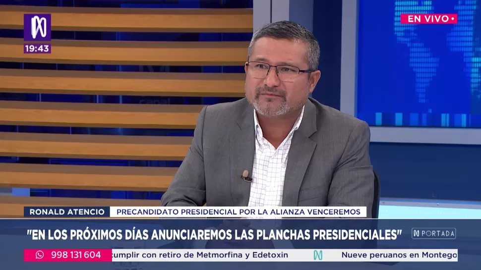 N PortadaRonald Atencio: Proponemos una transformación de la política peruanaN Portada / Canal NN Portada, de lunes a viernes a partir de las 07:00 p.m. por Canal N TagsN PortadaRelacionadasSalomón Lernes Ghitis: No veo ningún candidato que quiera gobernar con los mejores del paísJulio César Espinoza: La propuesta de jueces sin rostro es populistaCarlos Tubino: Voy a ser candidato al senadoJuan de la Puente: Carlos Álvarez es el auténtico outsiderRoque Benavides: No deja de sorprenderme la proactividad de JeríNatale Amprimo: La sentencia del TC por el caso Cócteles se caía de madura