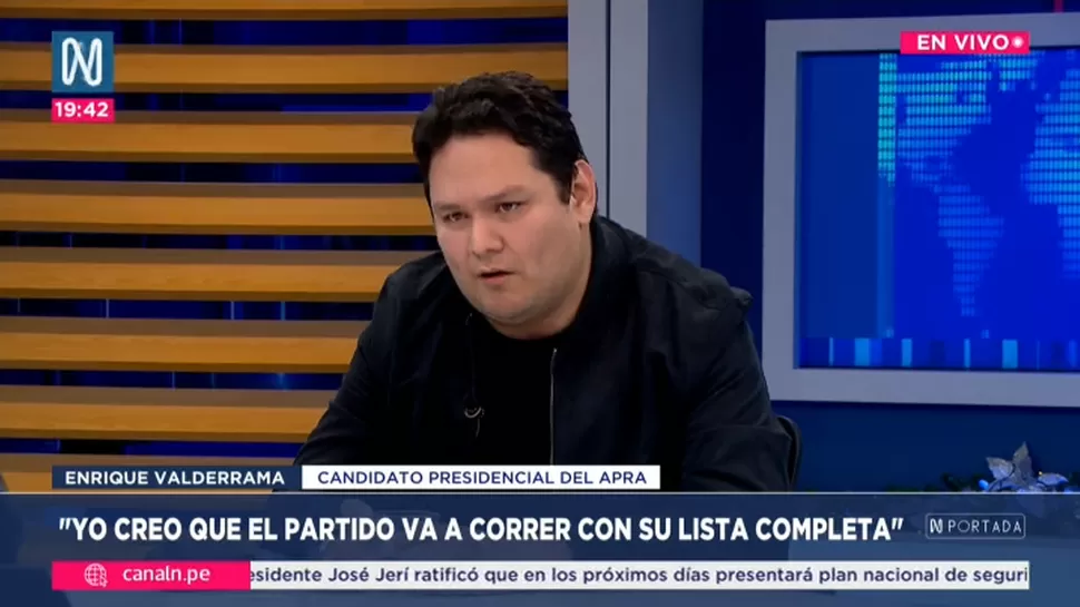 N PortadaValderrama: Yo creo que el partido va correr con su lista completaN Portada / Canal NN Portada, de lunes a viernes a partir de las 07:00 p.m. por Canal N TagsN PortadaRelacionadasCarlos Gallardo: El acuerdo fiscal del MEF necesita más acciones que anunciosCarlos Caro: Una sentencia del TC no puede ser inaplicadaHernán Chaparro: La vez anterior Rafael López Aliaga tampoco firmó el Pacto ÉticoTito Alegría: Cancelación de rutas es consecuencia directa del cobro de la TUUAMario Candia: Apostar solo por viaductos es antitécnico y responde más a una lógica políticaFlavio Cruz: Delia Espinoza ya sintoniza con el tema político