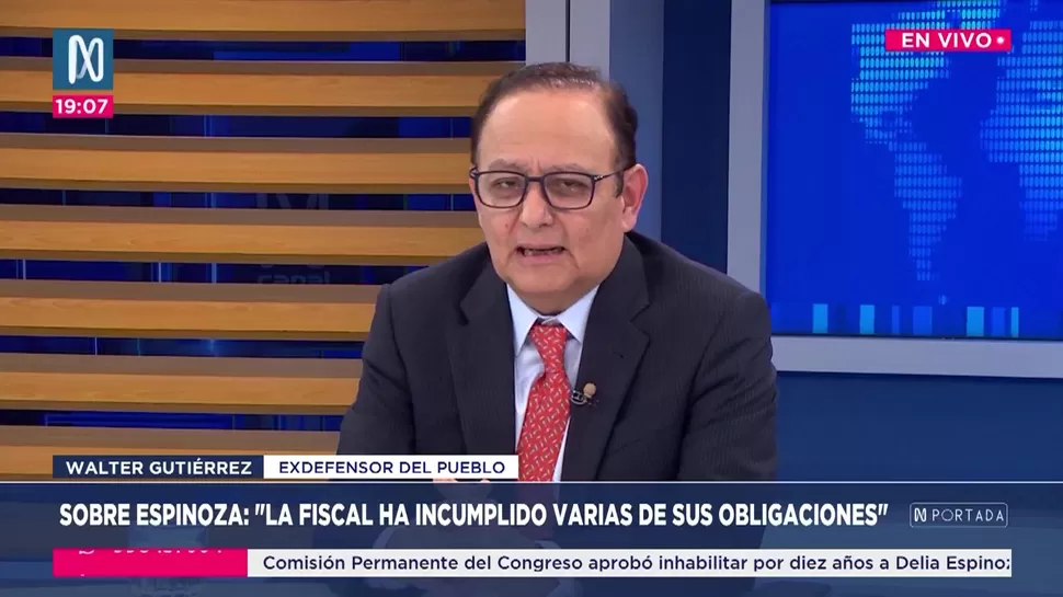 N PortadaWalter Gutiérrez: El Congreso sanciona a Delia Espinoza por incumplir la leyN Portada / Canal NN Portada, de lunes a viernes a partir de las 07:00 p.m. por Canal N TagsN PortadaRelacionadasCarlos Bruce: López Aliaga dejó varias obras interesantes, pero inconclusasJoseph Campos: La vacancia de Dina Boluarte vulneró su derecho a la defensaWalter Martinez: La nueva Superintendencia de Internamiento y Resocialización "modernizará" el sistema penitenciarioRennán Espinoza: Hay un liderazgo completamente dinstinto al gobierno anteriorMaría Eugenia Nievas: Somos militantes bien formados en Acción PopularGuillermo Aliaga: Extensión del REINFO puede considerarse bajo ciertos requisitos