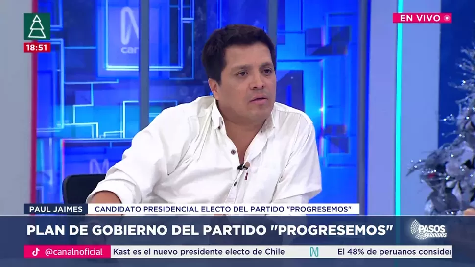 Paul Jaimes, candidato presidencial por el partido Progresemos, se presentó como una figura frontal, antisistema y anticorrupción. Criticó duramente a sus rivales políticos y rechazó tanto las etiquetas ideológicas tradicionales como el cálculo político. Planteó la aplicación de la pena de muerte y el retiro del Perú de la Corte Interamericana como medidas para combatir la inseguridad. Se mostró en contra de cualquier indulto a Pedro Castillo o expresidentes procesados por corrupción, pidiendo penas severas